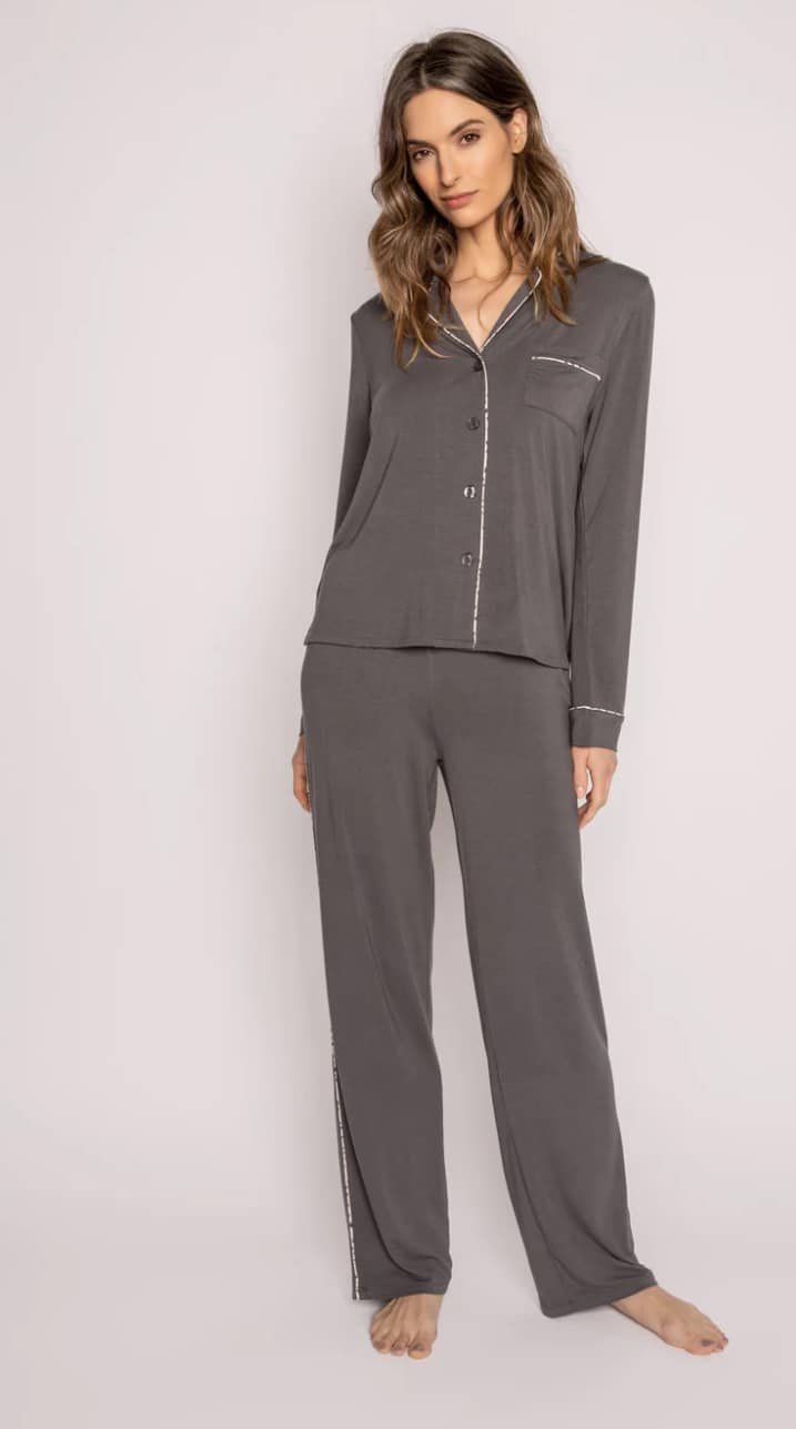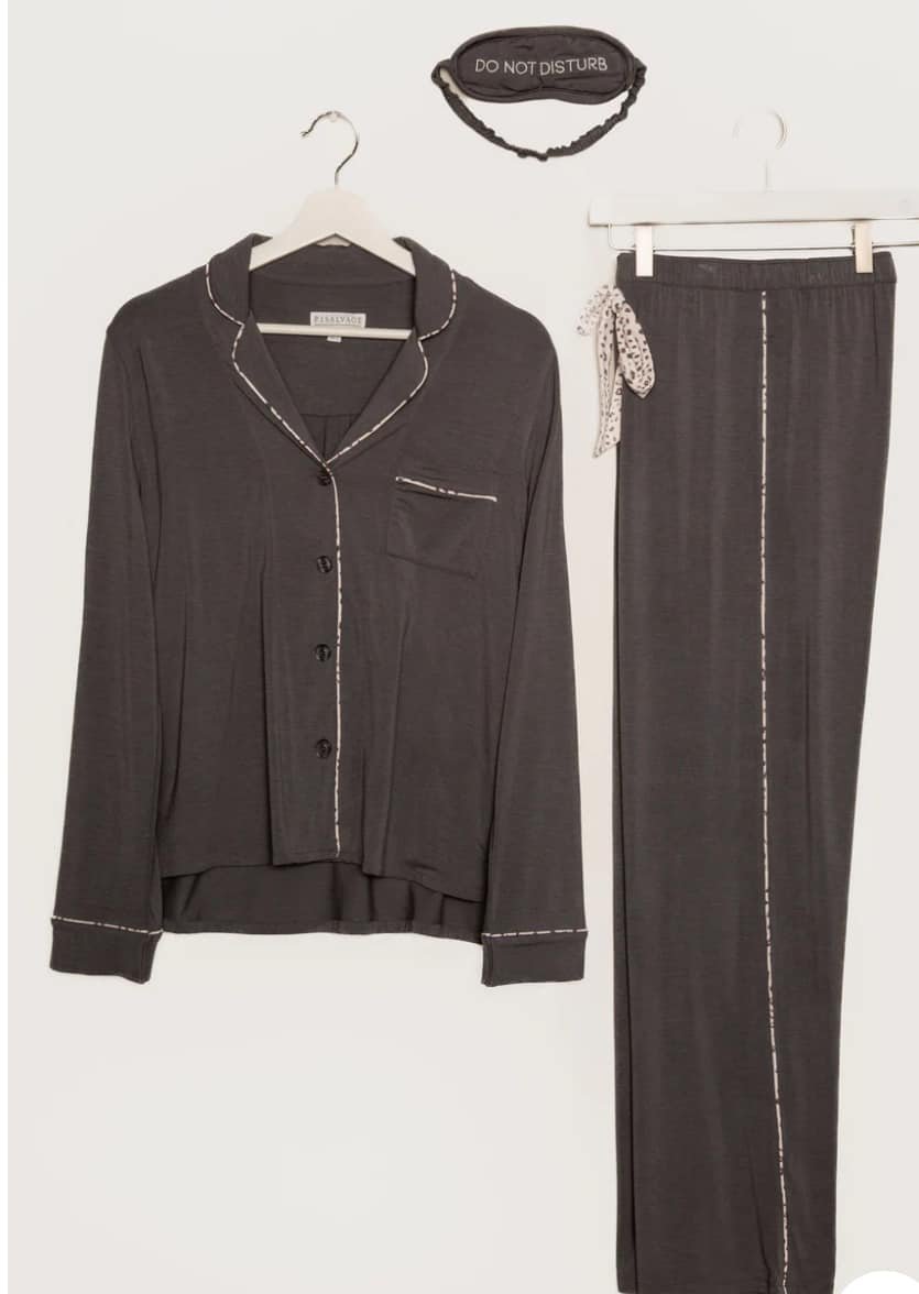 Experience ultimate comfort with this chic 3-piece pajama set, crafted from premium modal fabric for a soft & cozy feel. Available in sizes XS to XL, this set includes a button-down top with a classic notched collar, matching pants with an adjustable tie, and a “Do Not Disturb” eye mask to complete the look. Priced at $98, this set is perfect for a stylish night in or as a thoughtful gift for someone special. Embrace relaxation with elegance in this high-quality sleepwear essential.